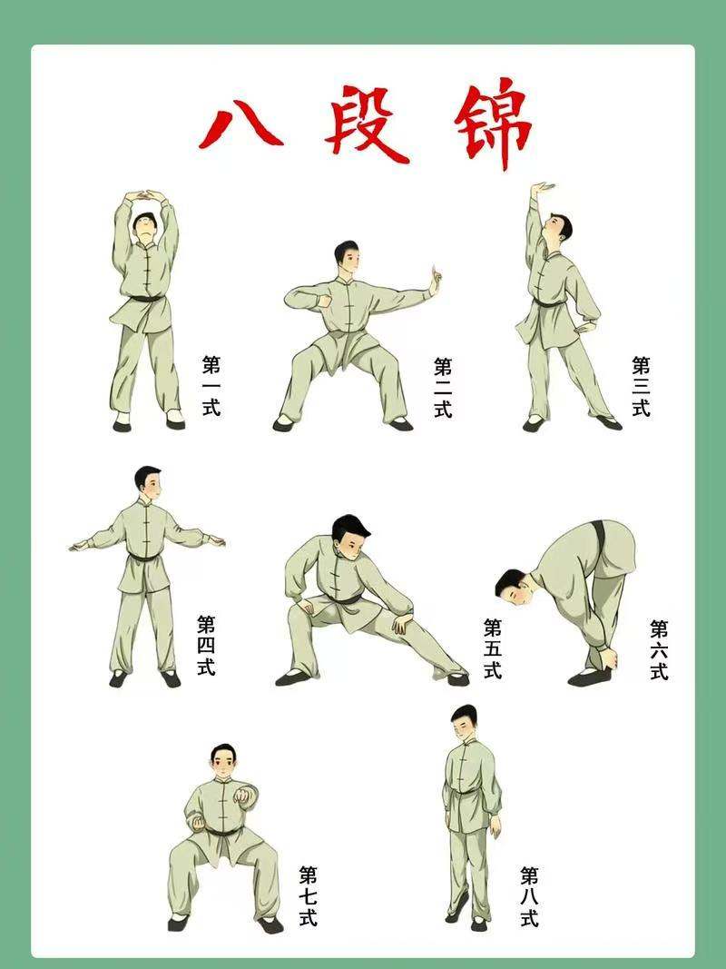 1.站势八段锦双手托天理三焦,左右开弓似射雕,调理脾胃须单举,五劳七伤往后瞧,摇头摆尾去心火,两手攀足固肾腰,攒拳怒目增气力,背后七颠百病消。