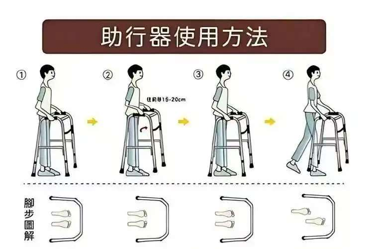 2.助行器置于面前,保证身体在助行器的框架里,切忌把助行器放在离自己很远的地方,健侧上肢手臂后伸扶住床面,患侧上肢抓住助行器中间站起。