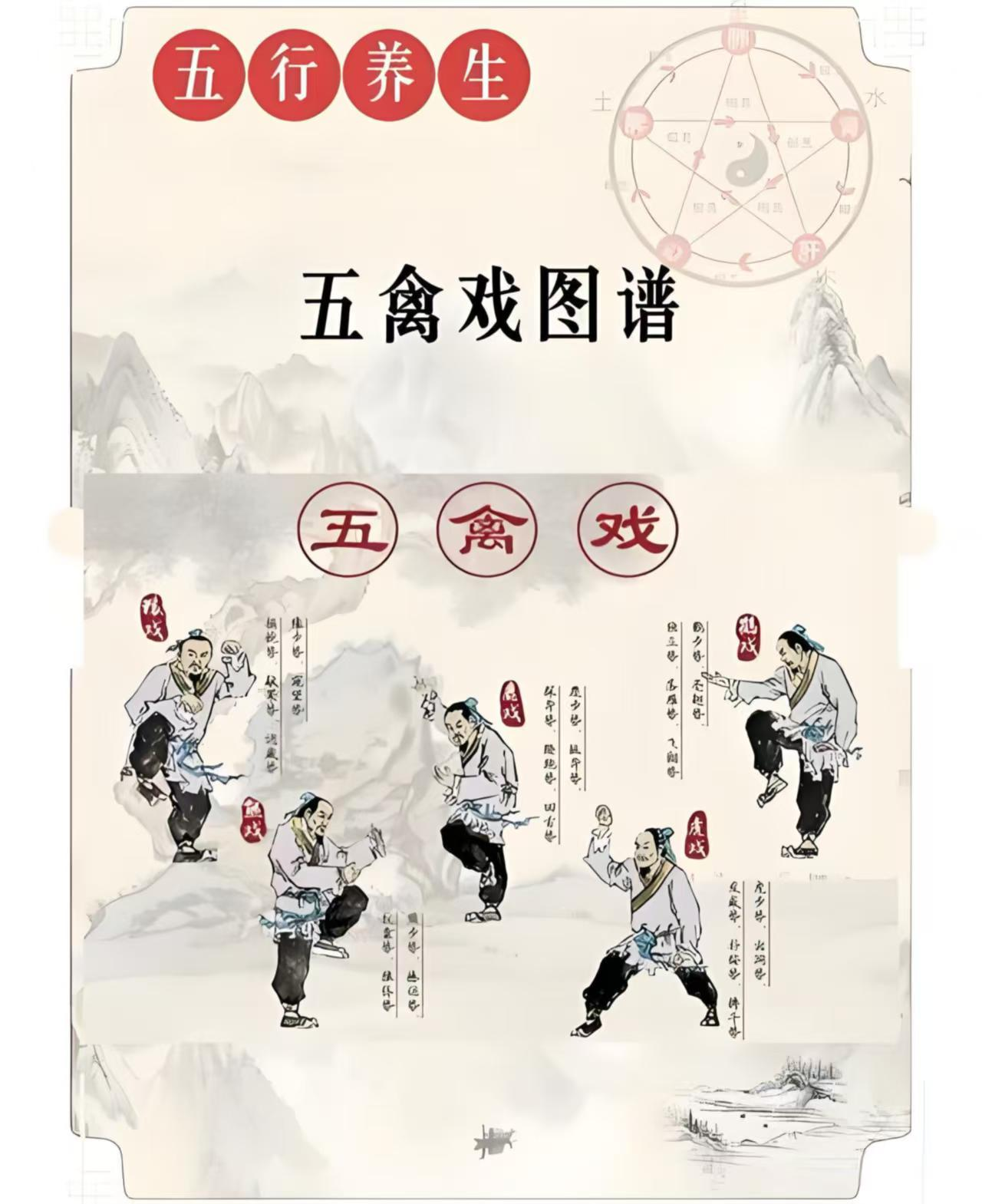 五禽戏又称“五禽操”“五禽气功”等,是由五种模仿动物的动作组成。是中国民间流传最广,也是流传时间最长的导引健身功法之一。后世依据宋·范晔《后汉书·华佗传》所载而作。该传引华佗的话:“吾有一术,名五禽之戏。一曰虎,二曰鹿,三曰熊,四日猿,五日鸟。亦以除疾,兼利蹄足,以当导引。”